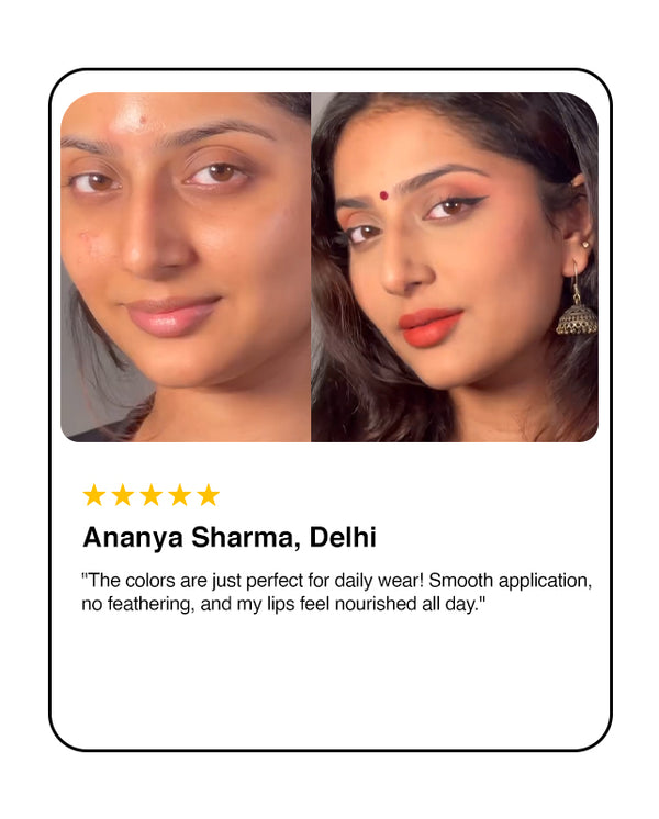 Infused with our Sciyurveda™ technology, this collection blends the nourishment of Castor Oil and Vitamin E for lips that stay soft, hydrated, and irresistibly smooth, all while flaunting rich, matte color.