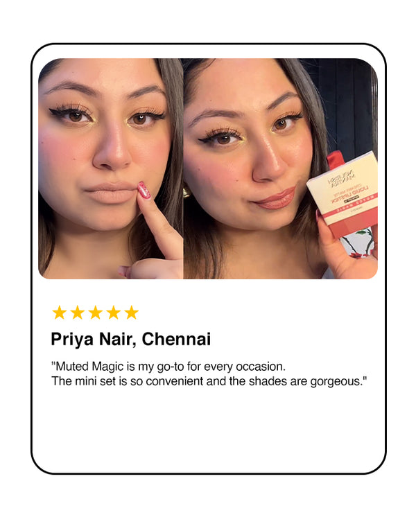 Step into the realm of timeless elegance with the Muted Magic Creamy Matte Lipstick set, a collection that transcends trends. This mini lipstick combo features four enchanting shades: Masoom Pink, Tedha Medha Hazelnut, Spice & Shanti, and Natkhat Berry. Designed for convenience, the creamy matte formula delivers intense color in a single stroke without layering. Enriched with Jojoba Oil, Vitamin E, and Shea Butter, these lipsticks nourish and hydrate while providing long-lasting, comfortable wear. Waterproof, smudge-proof, and transfer-proof, the shades stay precise throughout the day, with added SPF protection to guard your lips from sun damage. Perfect for any occasion, from casual outings to formal events, this lipstick set blends effortlessly with both traditional and Western attire, offering elegance and sophistication every time.