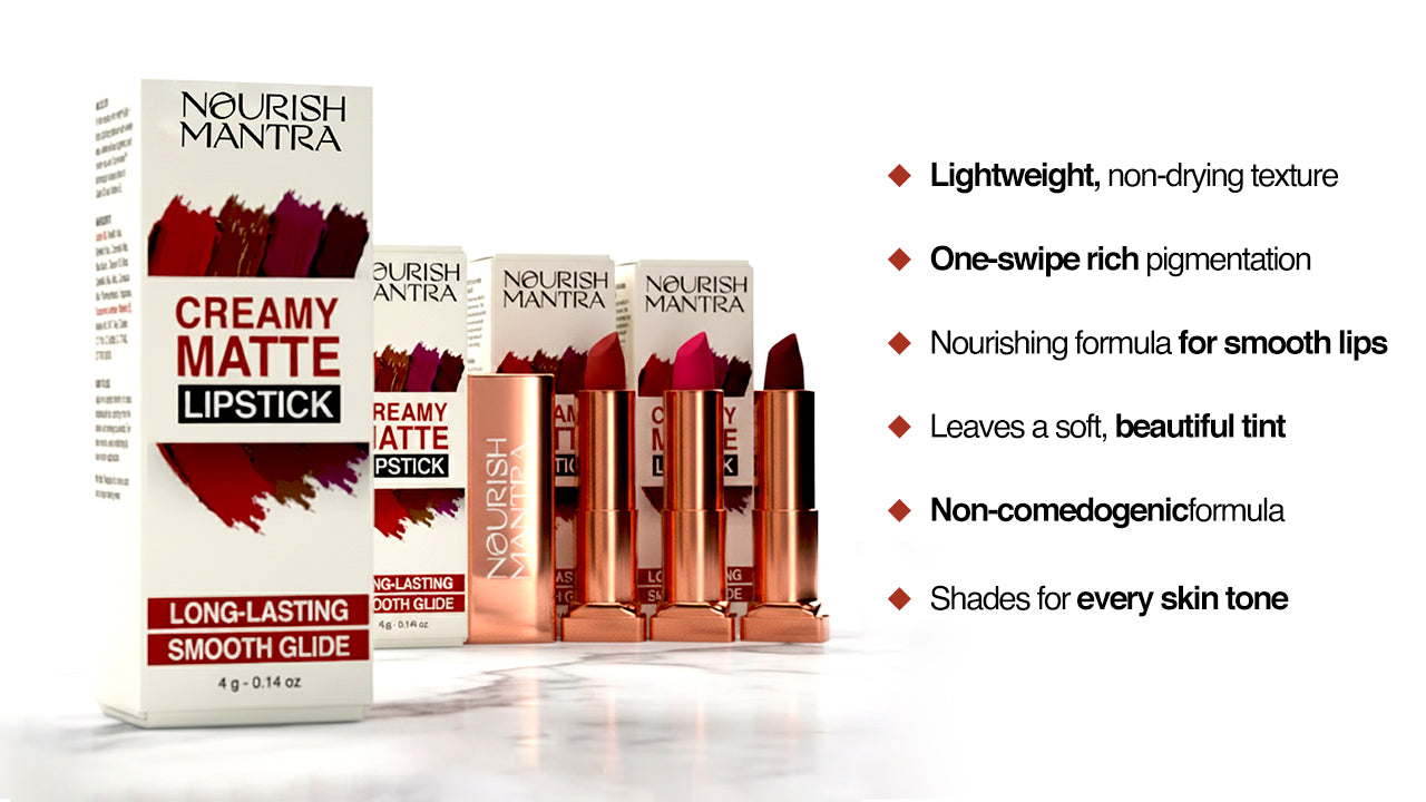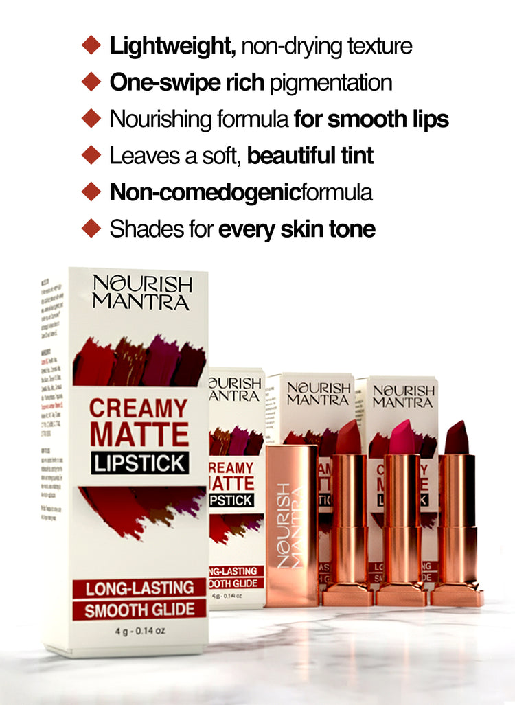 For the woman who wants it all – color, comfort, and care. Introducing Nourish Mantra Creamy Matte Lipsticks in 6 different shades, that celebrate elegance and unapologetic confidence. Each shade channels “Main Character Energy”, letting your lips do the talking while your aura takes over the room.