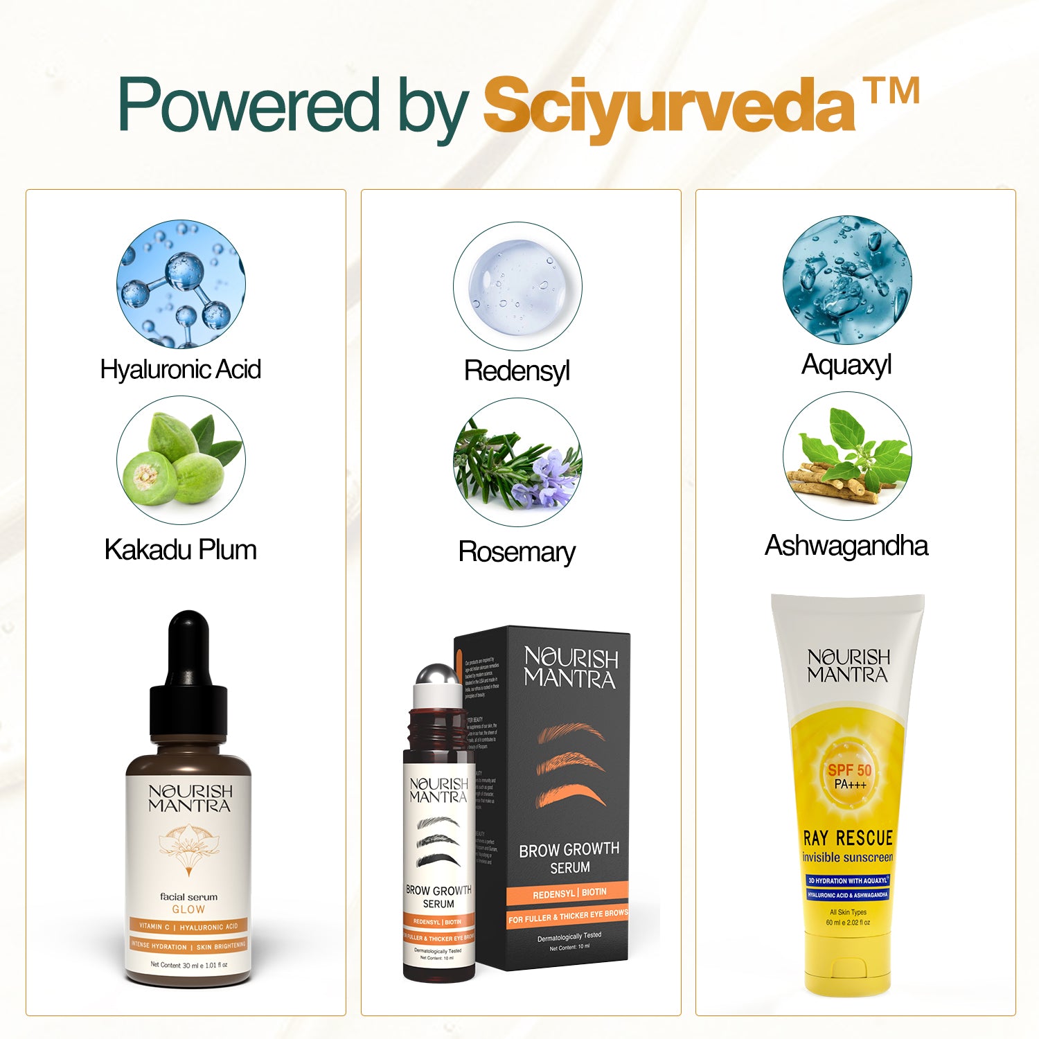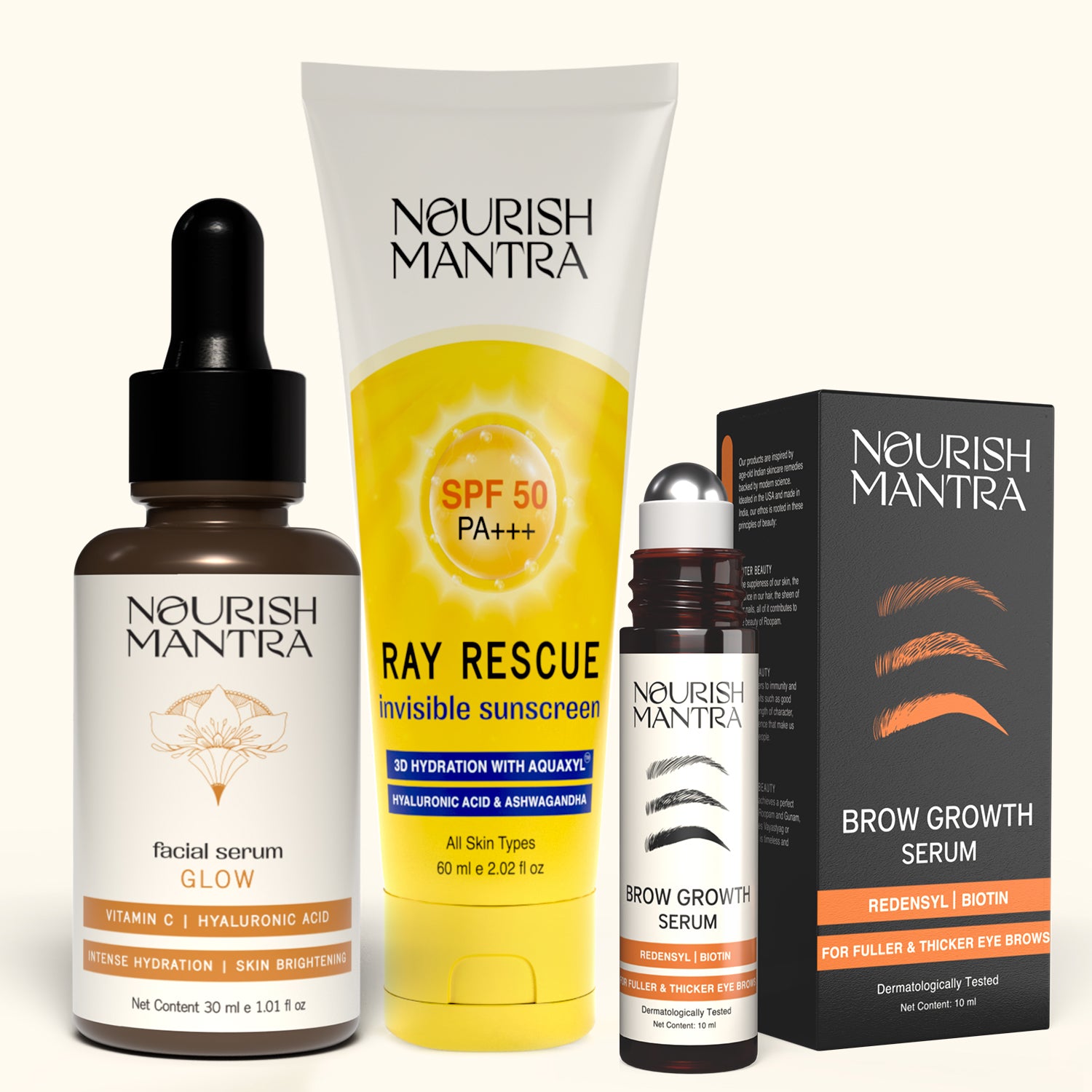 This thoughtfully curated combo brings together the Ray Rescue Invisible Sunscreen, Radiant Glow Serum, and Brow Growth Serum, three essentials made for daily care with visible results. Powered by our Sciyurveda™ technology, the glow serum and brow growth serum blend time-tested natural actives with modern science to deliver gentle yet effective care.