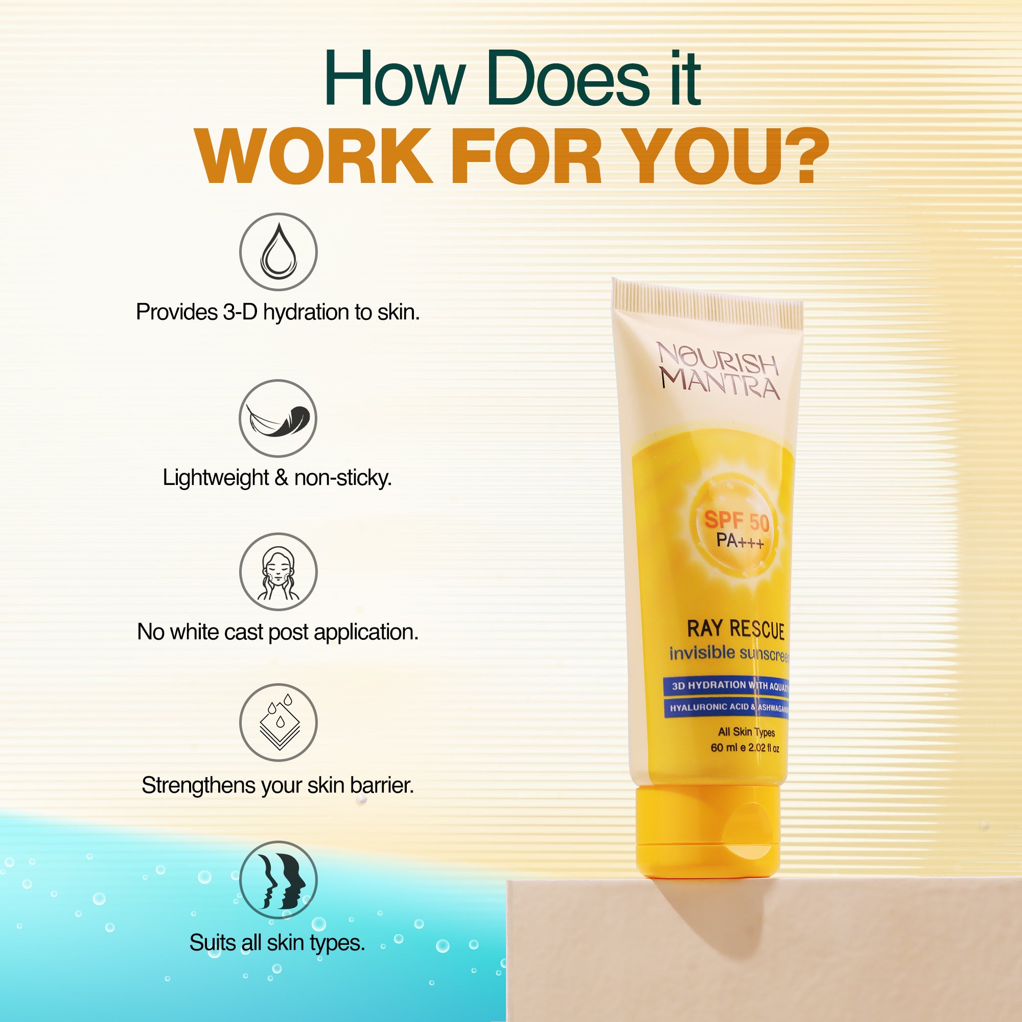 Water, Homosalate, Ethylhexyl Methoxycinnamate, Diethylamino Hydroxybenzoyl Hexyl Benzoate (Unival A+), Ethyl Salicylate, Octisalate, Propanediol, 1-3 Butylene Glycol, Glycerine, Cyclopentasiloxane, Phenoxyethanol (and) Ethylhexylglycerin, Dimethicone, Triethanol Amine, Carbomer, Hyaluronic Acid, Aloe Vera Extract (Aloe Barbadensis), Aquaxyl, Sodium Gluconate, Ashwagandha Extract (Withania Somnifera), Perfume.